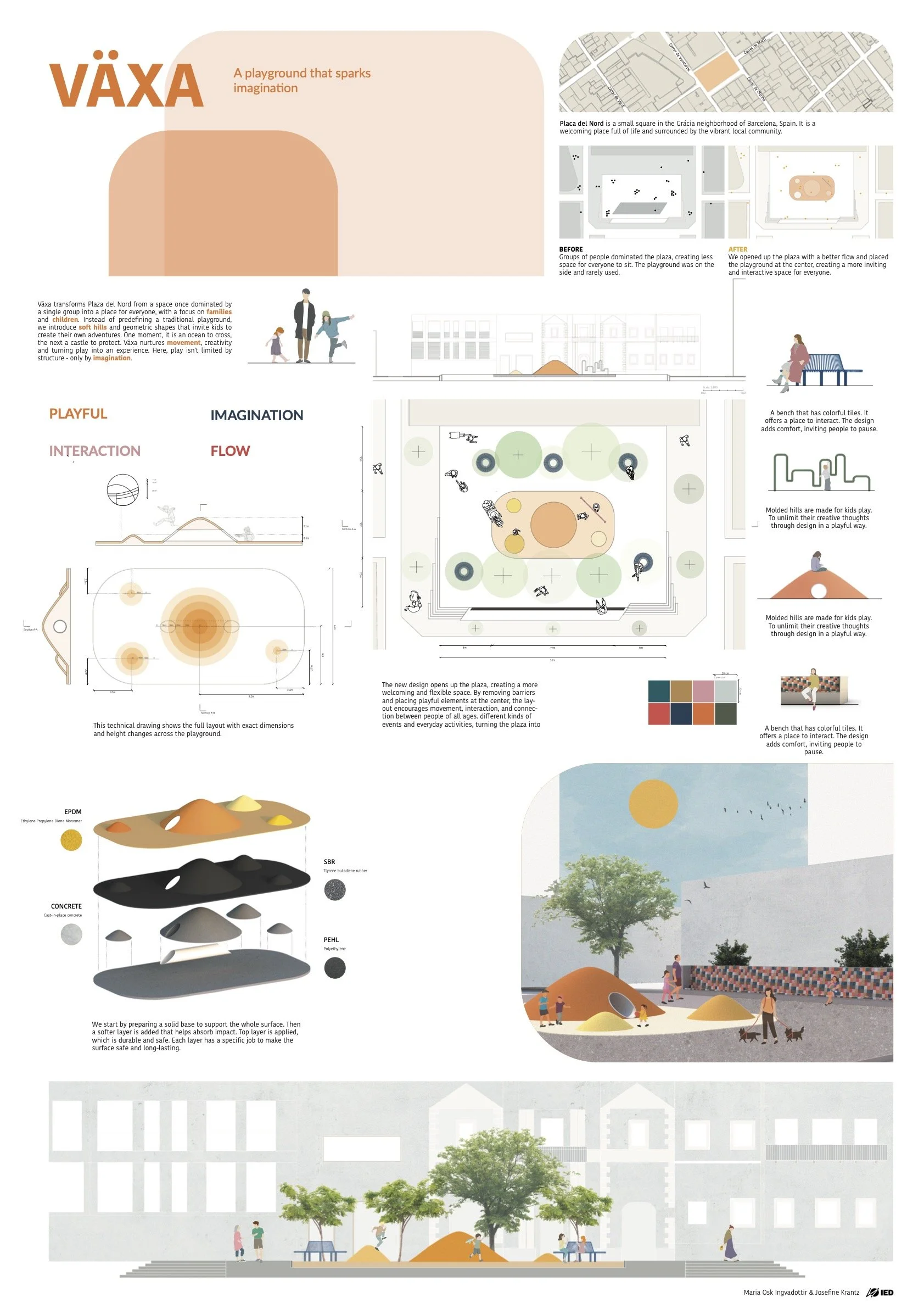 Växa transforms Plaza del Nord from a space once dominated by a single group into a place for everyone, with a focus on families and children. Instead of predefining a traditional playground, we introduce soft hills and geometric shapes that invite kids to create their own adventures. One moment, it is an ocean to cross, the next a castle to protect. Växa nurtures movement, creativity and turning play into an experience. Here, play isn’t limited by structure - only by imagination.