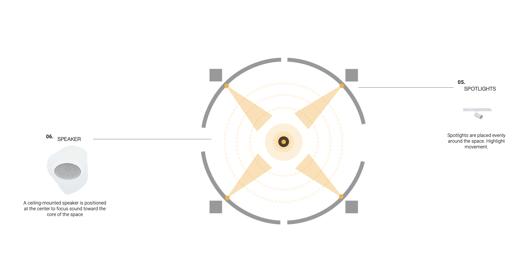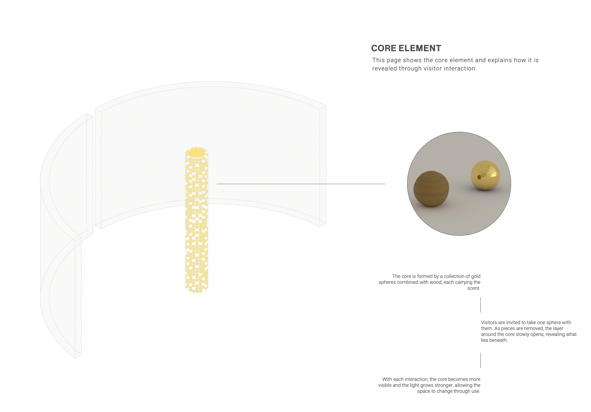 The core is defined by golden spheres, where scent is introduced to mark the most intimate part of the experience.