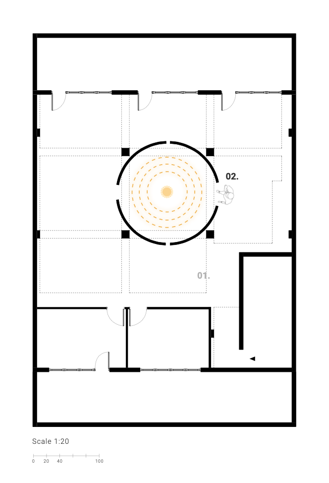 Visitors enter the larger space, notice light reflections from different angle, can move freely around.